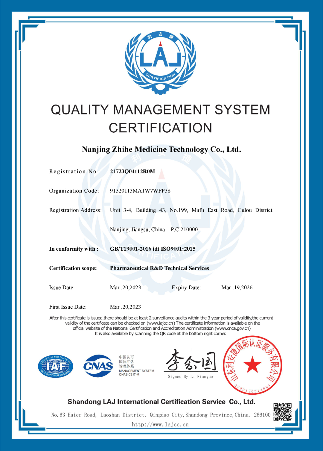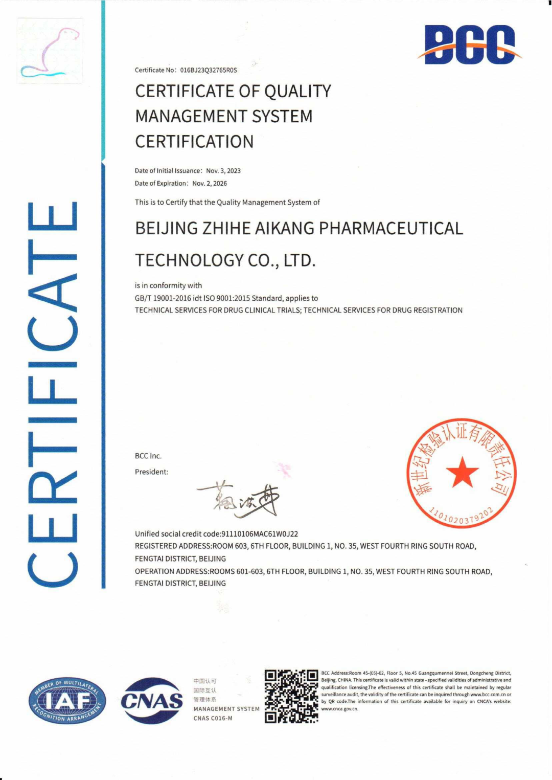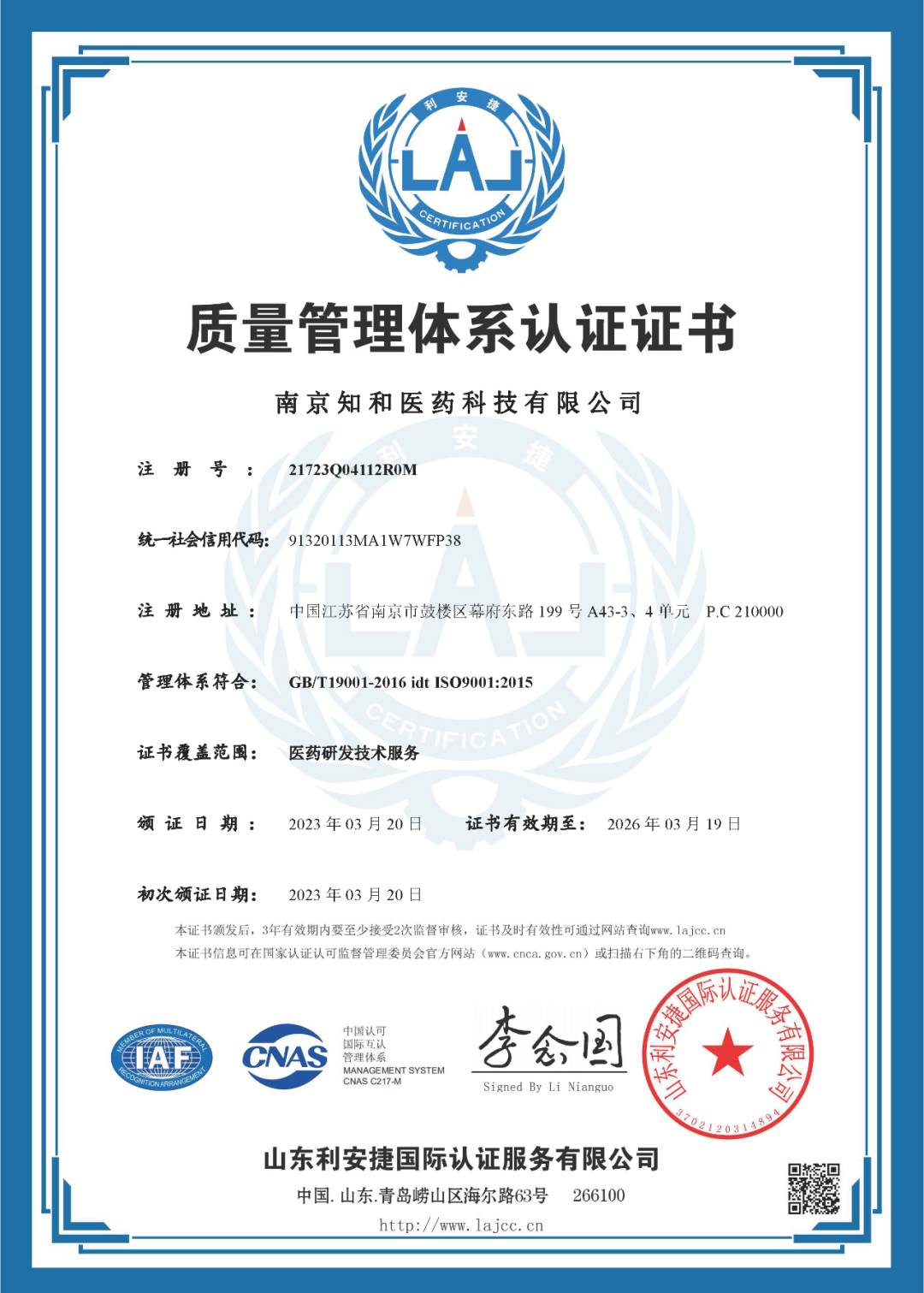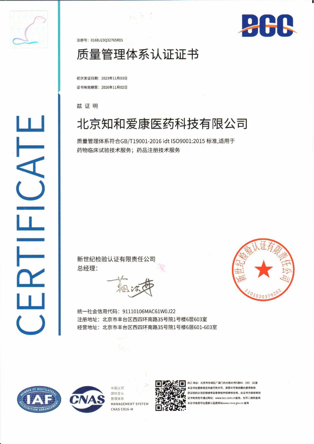 近日,北京知和(hé)愛康醫藥科技有(yǒu)限公司經過一系列全面、科學、嚴格、系統的(de)審查考核,通過國家GB/T19001-2016/ISO9001:2015體系認證,獲得《質量管理(lǐ)體系認證證書(shū)》,認證所覆蓋的(de)範圍爲:藥物(wù)臨床試驗技術(shù)服務,藥品注冊技術(shù)服務。