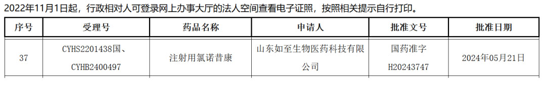 2024年05月(yuè)27日國家藥品監督管理(lǐ)局發布藥品批準證明(míng)文(wén)件(jiàn)送達信息,知和(hé)集團子公司山東如(rú)至生物(wù)的(de)注射用(yòng)氯諾昔康獲批上(shàng)市。