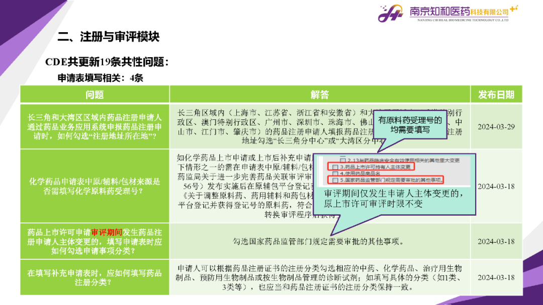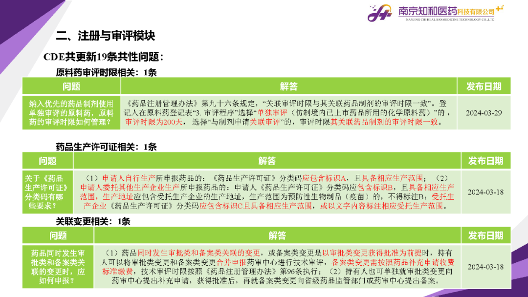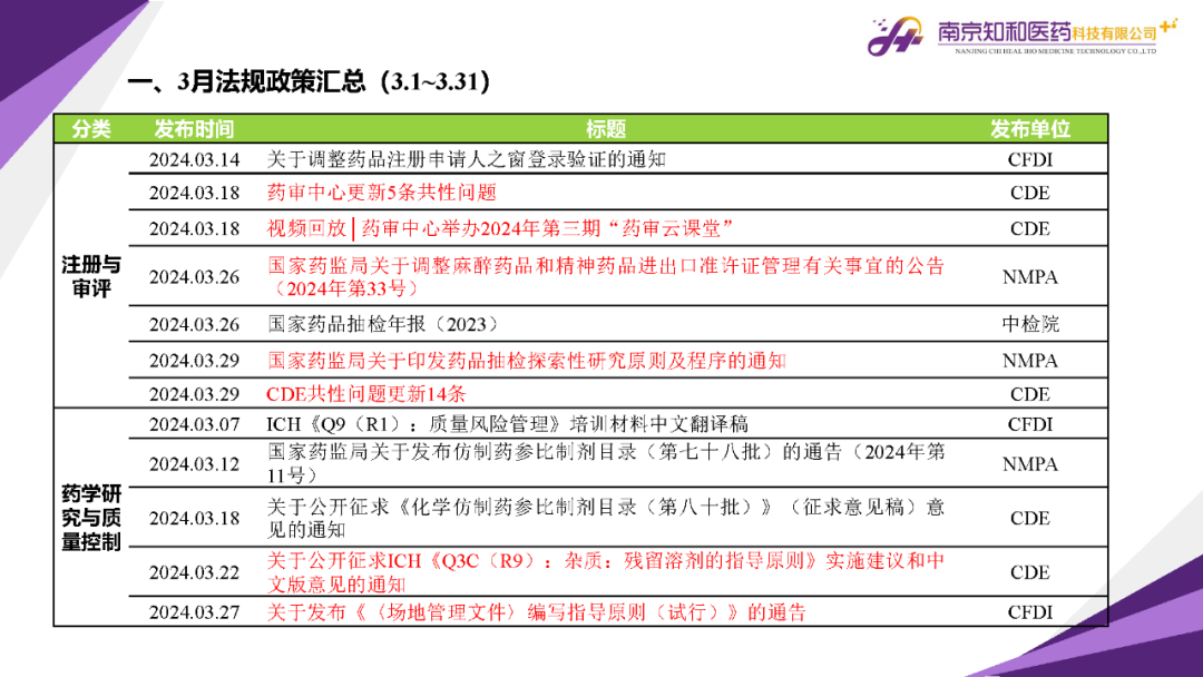 2024年4月(yuè)15日,知和(hé)醫藥注冊部帶來專題培訓《法規政策梳理(lǐ)與解讀(dú)》,從注冊與審評、藥學研究與質量控制(zhì)、臨床與非臨床、生物(wù)制(zhì)品與中藥等模塊對CDE、NMPA、CFDI、中檢院、國家不良反應檢測中心、國家中醫藥管理(lǐ)局、山東省局等權威單位2024年3月(yuè)發布的(de)20條法規政策及通知做深入梳理(lǐ)與解讀(dú),開(kāi)展專題培訓。