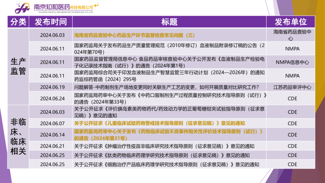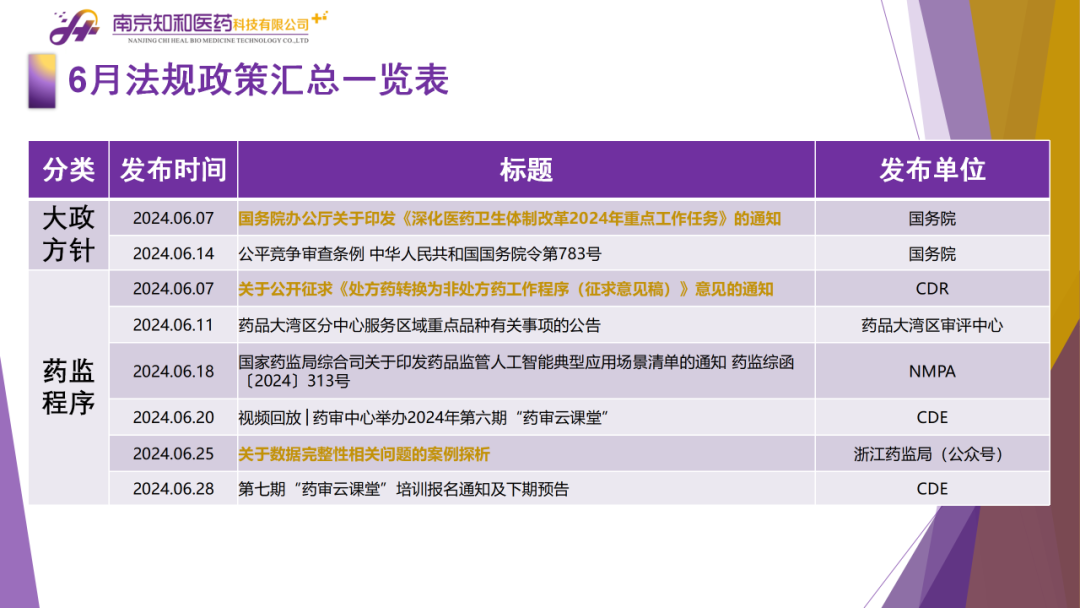 2024年7月(yuè)9日,知和(hé)醫藥注冊部帶來專題培訓《法規政策梳理(lǐ)與解讀(dú)》,從大(dà)政方針、藥監程序、化藥相(xiàng)關、生産監管、臨床與非臨床、生物(wù)制(zhì)品相(xiàng)關、集采相(xiàng)關等模塊對國務院、CDE、浙江藥監局、NMPA、藥品大(dà)灣區審評中心、海(hǎi)南省藥品查驗中心、CDR等權威單位2024年6月(yuè)發布的(de)40條法規政策及通知做深入梳理(lǐ)與解讀(dú),開(kāi)展專題培訓。